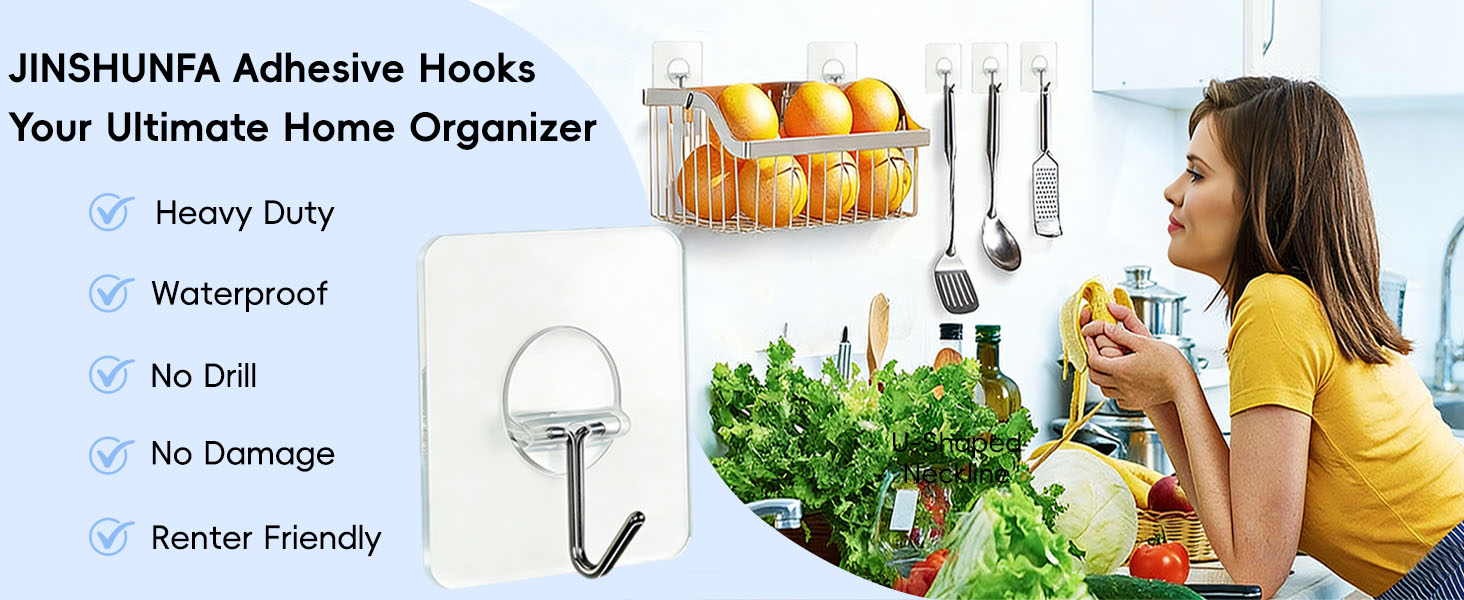 JINSHUNFA Adhesive Wall Hooks 13LB Heavy Duty No Drill Transparent Waterproof Hooks for Bathroom Kitchen Towel Coat 8 Pack